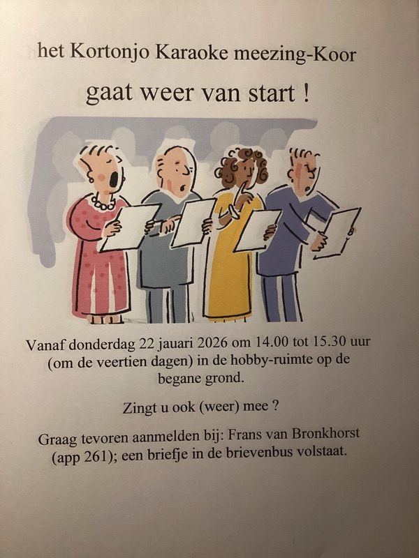 Het Kortonjo meezingkoor repeteert gemiddeld 1x in de 2 weken op de donderdagmiddag (14:00 – 15:30). Op een groot scherm wordt de tekst getoond en worden de liedjes meegezongen op de achtergrondmelodie. De lat ligt niet hoog, het gezellig samen zingen staat voorop.